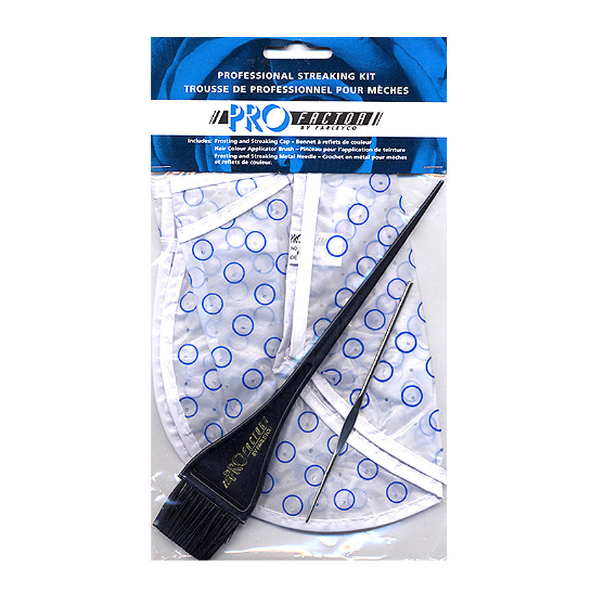 Profactor Professional Three Piece Streaking Kit are used by Salon Professionals. The 3-piece kit includes: Frosting and Streaking Cap, Hair Applicator Brush, and Frosting and Streaking Metal Needle.