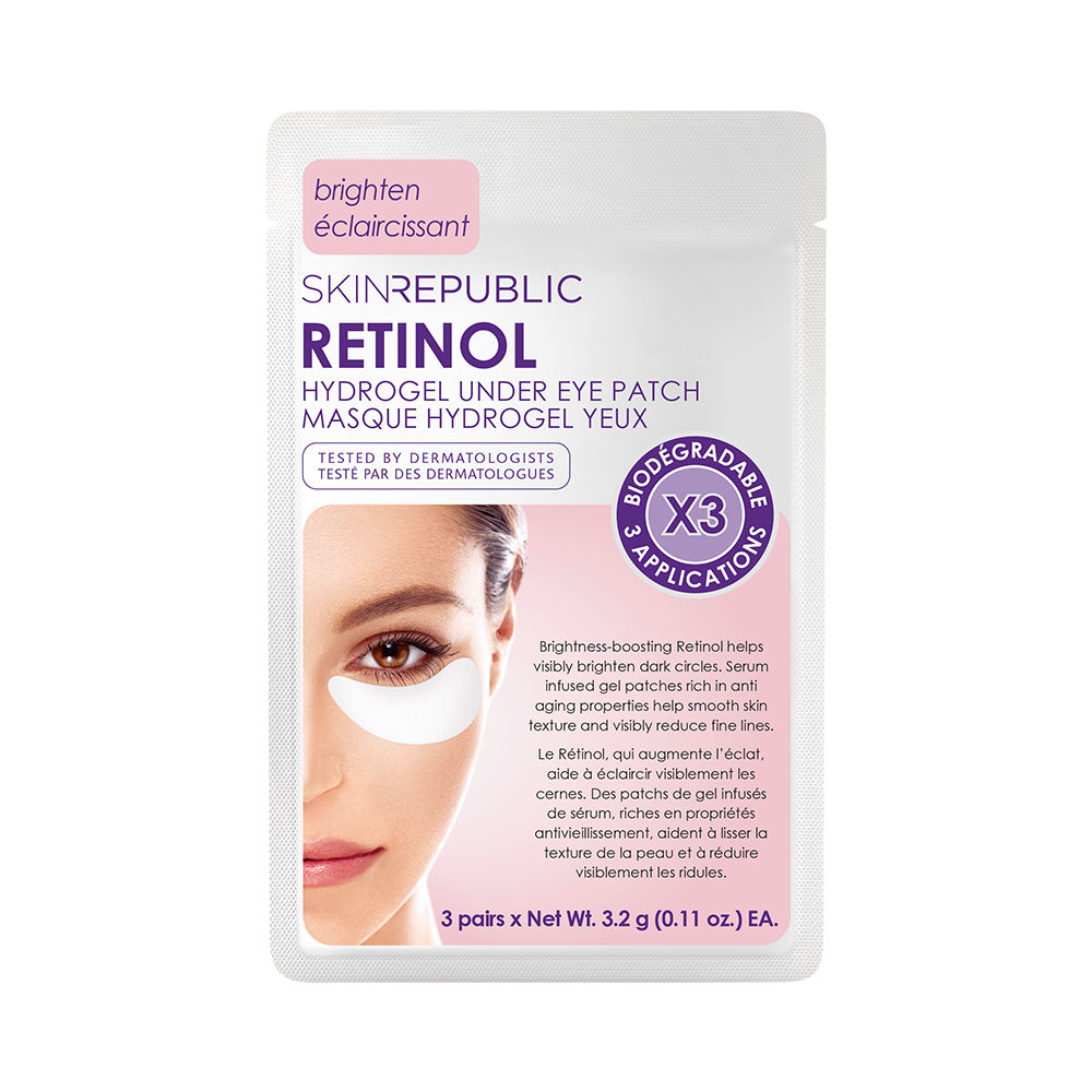 Brightness boosting retinol helps brighten dark circles and visibly improve the appearance of pigmentation. Serum infused gel patches, rich in anti-aging actives, help smooth skin texture and visibly reduce fine lines. Enriched with vitamin B5 to soothe skin. Eyes appear younger and well rested.